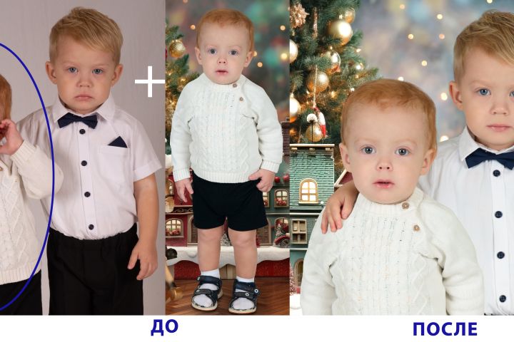 Поставила ребенка с другого кадра, вписала кисть руки, дорисовала рубашку, повлияла на улыбку