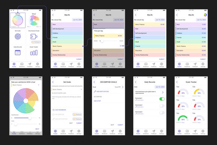 Разработка дизайна мобильного приложения постановки целей и колеса баланса