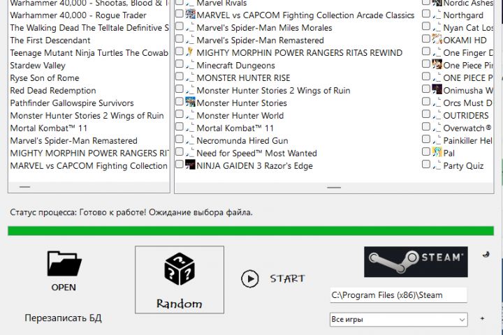 Лаунчер позволяет выбрать папку с ярлыками, добавить интеграцию со Steam (система проверит, какие игры установлены локально), рандомизировать - система при этом подберет случайную игру, и запустить.