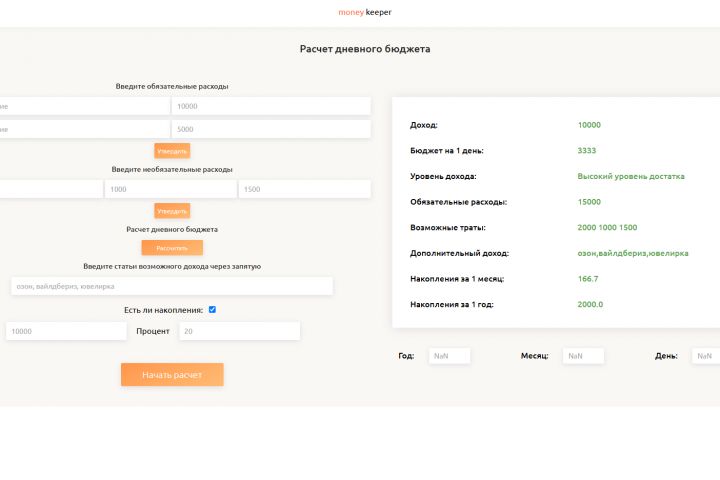КАЛЬКУЛЯТОР написан на нативном Javascript Взял его с курса, отлично подойдет для начинающих, чтоб понять как работать с javascript. В нём высчитывается ваш доход за 1 месяц, бюджет на 1 день из 30 дней, какой у вас уровень дохода от низкого до выского, так же можете ввести обязательные расходы, возможные траты, дополнительный доход, накопления за 1 месяц и за 1 год.