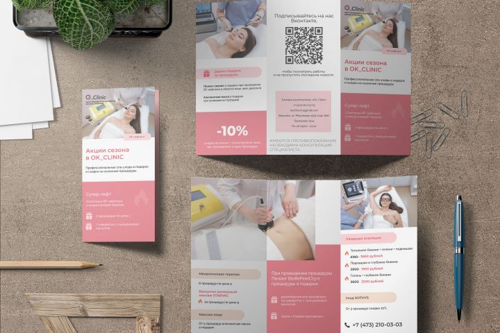 Дизайн листовки по косметологии выполнен в аккуратном стиле, с акцентом на максимальное количество фото и описания акций