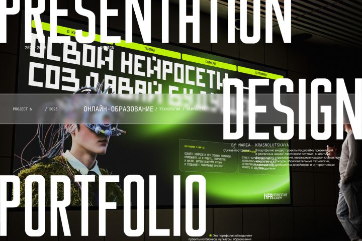 Создать динамичную и футуристичную презентацию для образовательного курса по нейросетям. Основная цель — привлечь внимание потенциальных учеников из разных сфер (дизайнеров, копирайтеров, IT-специалистов, маркетологов и предпринимателей), подчеркнув актуальность и практическую пользу курса.