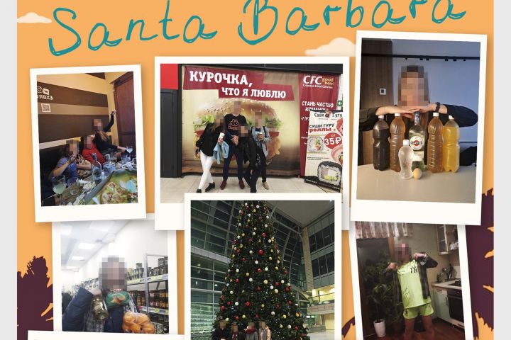 Большая броская надпись "Санта-Барбара", выполненная в духе оригинального логотипа, задающая настроение и придающая коллажу кинематографический эффект.