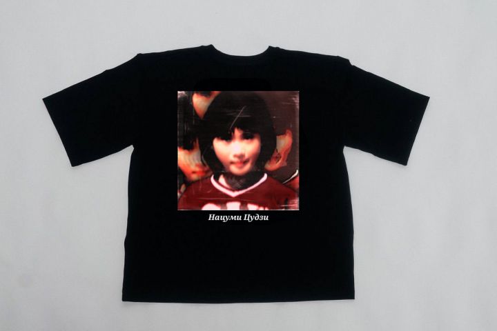Создать принт для футболки в оттенках красный-черный, с девушкой из Японии которая прославилась в убийстве своей одноклассницы.