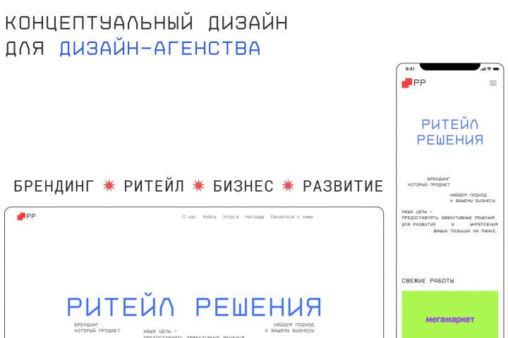 Задача заключалась в том, чтобы разработать концепцию 1-ого экрана для дизайн-агентства (специализация ритейл и брендинг). Главная задача - показать креатив (интересная типографика, цвета, анимация).