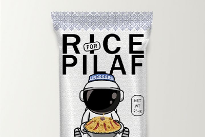 Создать дизайн упаковки для мешка, который будет соответствовать концепции существующего мешка для риса для суши, но адаптирован для нового продукта — риса для плова. Дизайн должен включать элементы текущего космонафта восточного стиля, подчеркивающие аутентичность продукта.