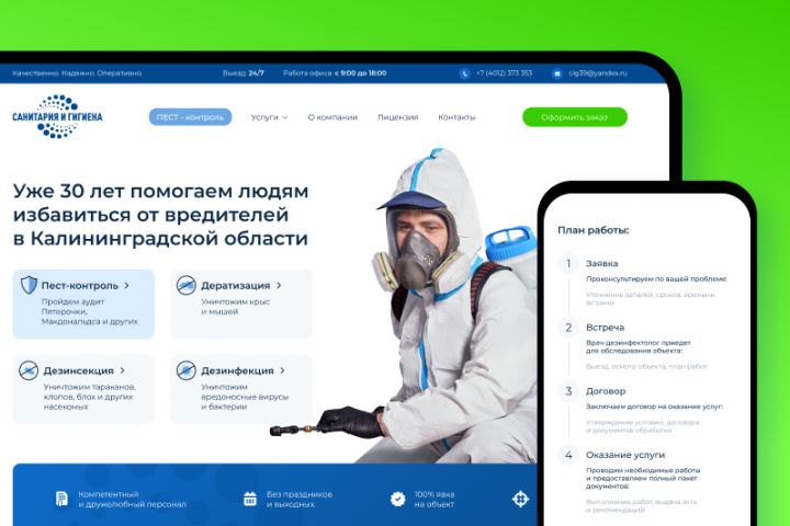 Санитария и гигиена — борется с вредителями на предприятиях и складах. Около 5 лет назад я разработал им логотип, а в конце 2024 года заказчик снова обратился ко мне уже за редизайном сайта.