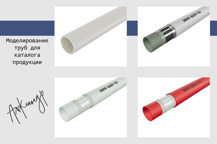 Создание 3D-модели труб с высокой детализацией для использования в каталоге продукции. Точное соответствие размеров, материалов и характеристик, чтобы подробно показать конструкцию и состав изделия. Модели подготовлены с акцентом на визуальную привлекательность и реалистичность, идеально подходят для технических материалов, каталогов и презентаций, подчеркивая особенности продукции.