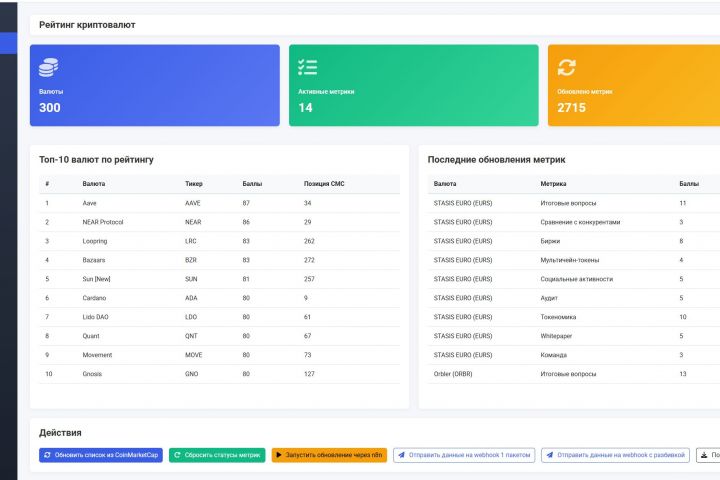 Сервис для мониторинга и аналитики криптовалют, включающий оценку 300+ токенов по 14 метрикам, с автосинхронизацией с сайтом и AI-анализом. Предусмотрена административная панель. Используется как инструмент оценки инвестиционной привлекательности активов.