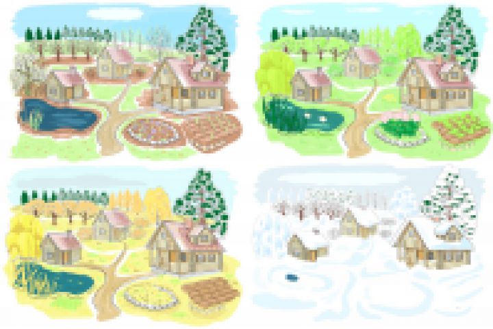 Иллюстрация для сайта. Задача: нарисовать дачный участок весной, летом, осенью и зимой.