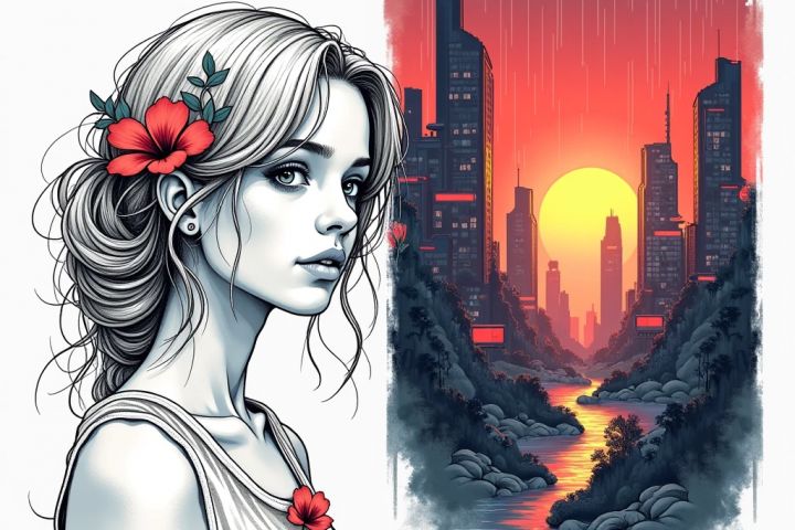 Монохромный рисунок девушки с цветами в волосах в стиле линейной графики. Фэнтези-пейзаж c ярким закатом, цифровая живопись.
