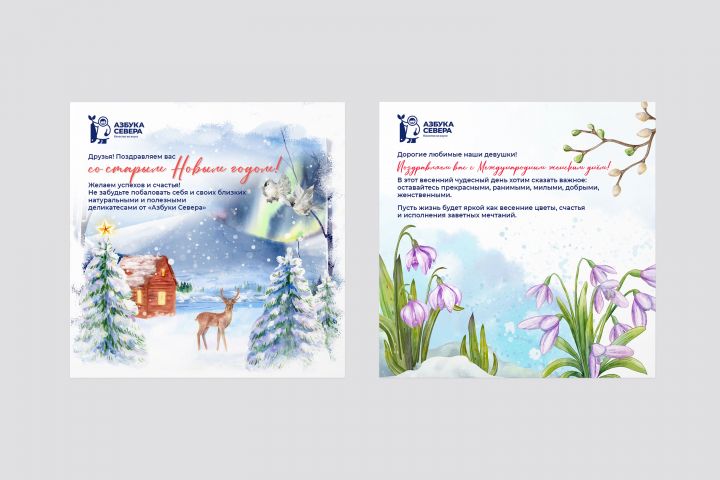 Дизайн оформление открыток на праздники, для компании " АЗБУКА СЕВЕРА"