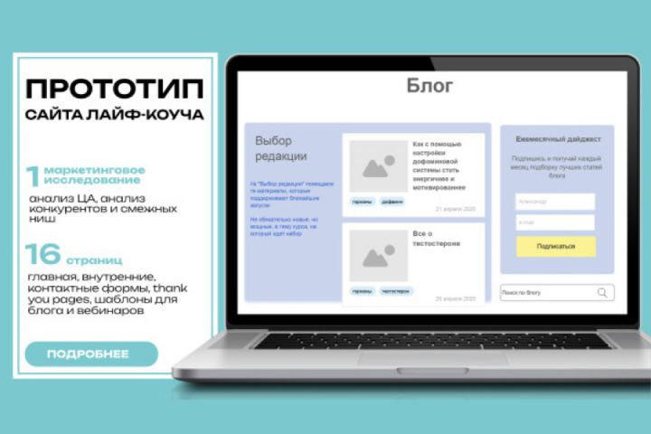 Задача: разработать прототип сайта лайф-коуча, включая главную страницу, все второстепенные по числу курсов и услуг, шаблоны для вебинаров и статей, вспомогательные формы и сопутствующие страницы