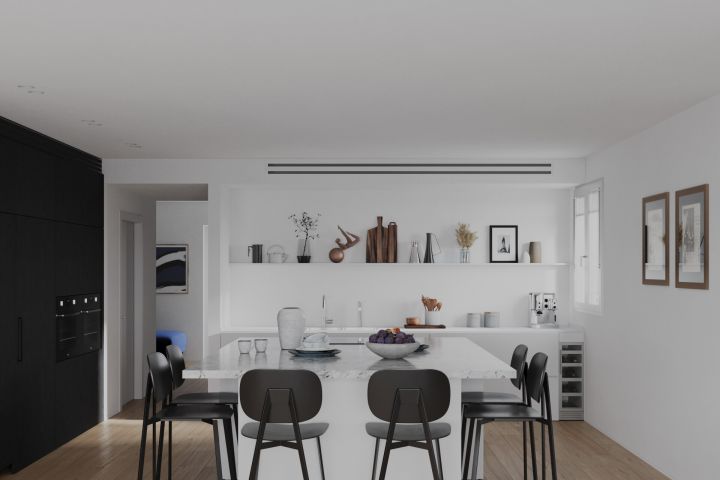 Визуализация просторных апартаментов, состоящих из кухни, гостиной и обеденной зоны и отдельного кабинета.