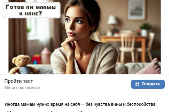 🔹 Разработала сценарий и создала чат-бот «Готов ли малыш к няне?!» — лёгкий и вовлекающий тест с персональной рекомендацией.