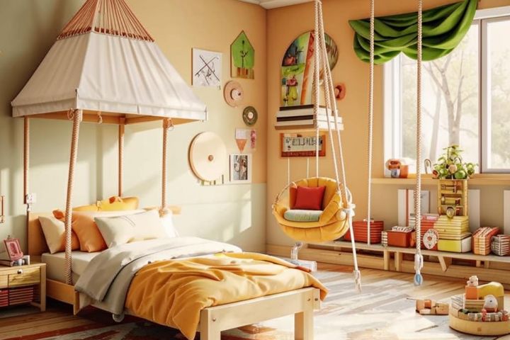 В другой части комнаты установлены гамак или качели, создающие расслабляющую атмосферу для отдыха и чтения. Эта часть интерьера подчеркивает комфорт и свободу пространства, что идеально подходит для детей.