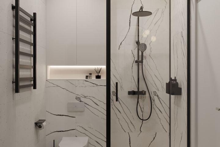 Санузел в сочетании контрастного керамогранита под мрамор и светлого терраццо.