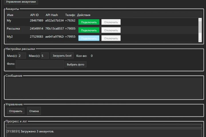 Приложение для мультирассылки личных сообщений в Телеграм. Так же есть функции парсера никнеймов для рассылки из чатов, сохранения истории чатов , даже где это запрещено, сбор всех данных о участниках чата с их ссылками и био.