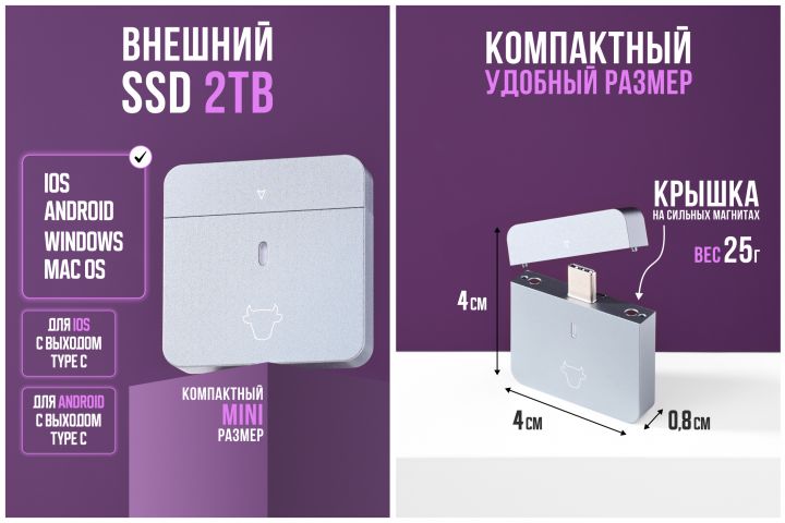 Съемка SSD мини для маркетплейсов + ретушь фотографий и замена цвета фона для разного объема устройства ( 1ТБ, 2 ТБ). Так же была выполнена видеосъемка - инструкция к использованию.