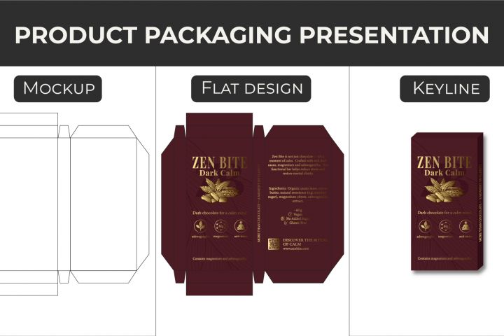 Клиент обратился с задачей создать упаковку для функционального шоколада, который не просто вкусный, но и оказывает антистрессовое действие за счёт магния и ашваганды. Нужно было подчеркнуть премиальность продукта, визуально связать его с ощущением спокойствия, внутреннего баланса и современного подхода к заботе о себе.