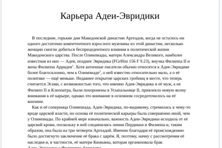 Задача очевидная: перевести статью о политической карьере Адеи-Эвридики из династии Аргеадов с английского на русский с сохранением стилистических особенностей, вычитать и отредактировать.