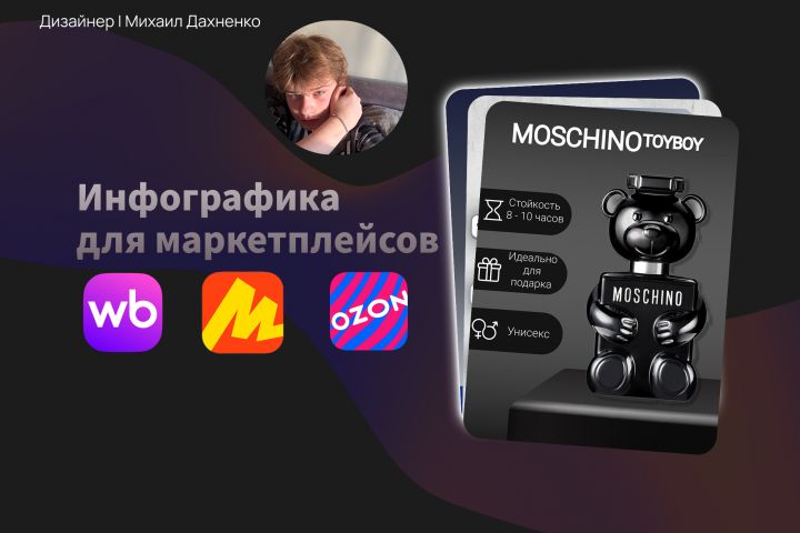 Привет! Меня зовут Миша — я дизайнер, специализирующийся на инфографике и карточках для маркетплейсов.