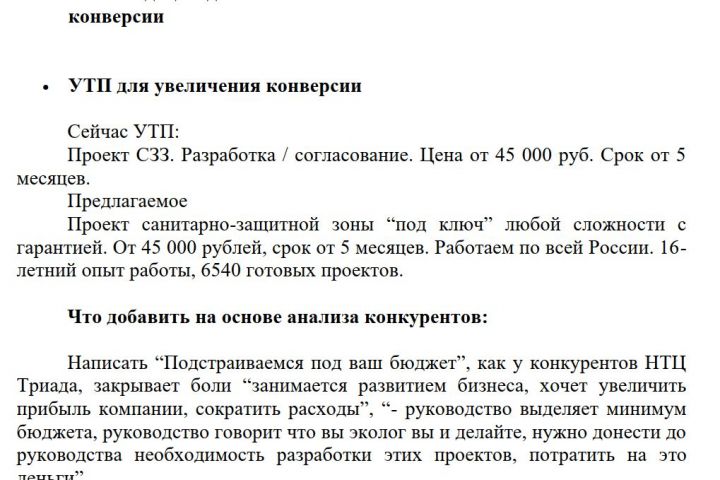 Анализ ЦА, составление аватаров клиентов, анализ 10 конкурентов по услуге "Проект СЗЗ", предложения по улучшению сайта.
