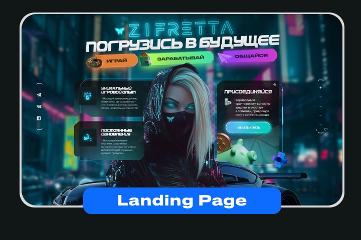 Передать футуристическую атмосферу игры через неоновую палитру, динамичные элементы и современный интерфейс. Особенность проекта: игроки смогут зарабатывать криптовалюту и торговать внутриигровыми предметами. Дизайн сочетает стиль, функциональность и тренды киберкультуры.