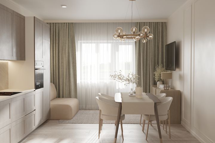 Кухня -гостиная была создана в светлой цветовой гамме. Холодильник и духовой шкаф встроены в колонны. Столовая группа была подобранна невероятно нежной . Также имеется зона отдыха с небольшим диваном , расположившись на котором можно смотреть телевизор.