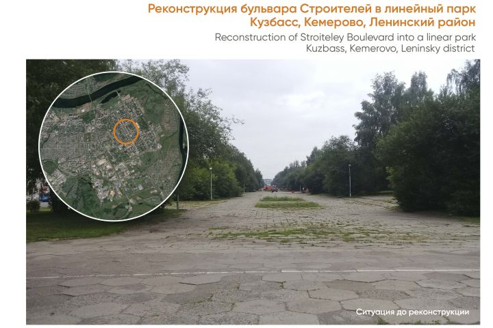 Концепция - "природная структура". Заказчики: Минстрой РФ, АИЖК, КБ Стрелка, Администрация города Кемерово. Одним из основных принципов благоустройства бульвара являлось преобразование пустынной эспланады, в линейный парк, имеющий природный ландшафт. Это потребовало дополнительной высадки деревьев и кустарников, создания природоподобной структуры.