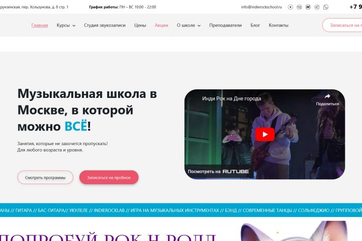 Школа рока Indie Rock School столкнулась с проблемой: потенциальные ученики и их родители воспринимали ее как обычную музыкальную школу, несмотря на уникальную атмосферу, индивидуальный подход и специализацию на indie-роке. Задача состояла в создании стильного, запоминающегося сайта-визитки, который передаст дух рок-музыки, подчеркнет преимущества школы и привлечет новых учеников.