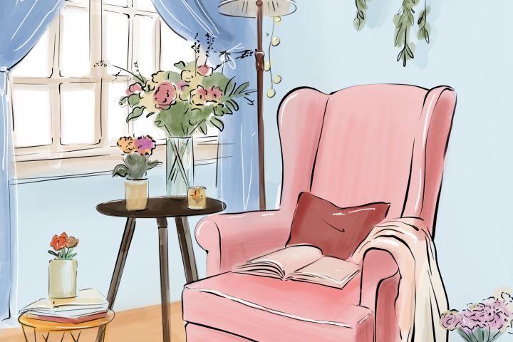 В центре композиции — стильное кресло, которое приглашает вас устроиться поудобнее с книгой или чашкой чая. Рядом расположена элегантная тумбочка, на которой можно разместить любимые аксессуары или книги. Окно, обрамленное легкими шторами, наполняет пространство естественным светом, подчеркивая текстуры и цвета.