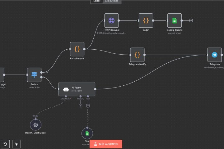 -AI Agent с OpenAI Chat Model помогает интерпретировать и структурировать данные для пользователя.