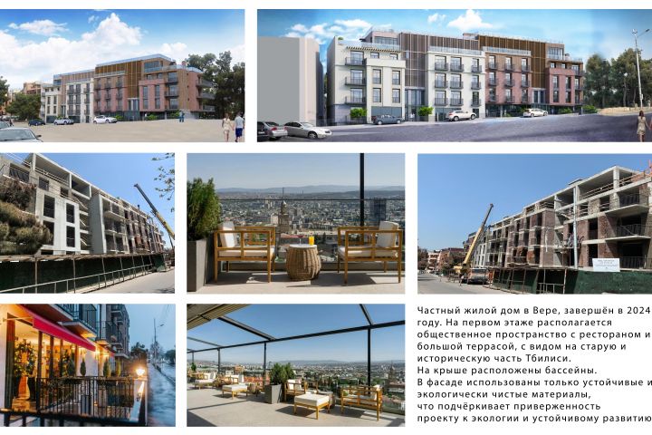 Частный жилой дом в Вере, завершён в 2024 году. На первом этаже располагается общественное пространство с рестораном и большой террасой, с видом на старую и историческую часть Тбилиси. На крыше расположены бассейны. В фасаде использованы только устойчивые и экологически чистые материалы, что подчёркивает приверженность проекту к экологии и устойчивому развитию.