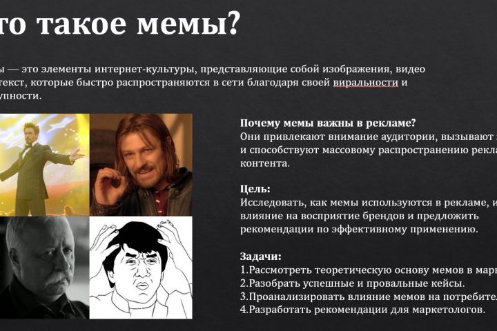 Необходимо было разработать презентацию для предмета «Разработка и продвижение вирального контента» по теме "Использование мемов в рекламе"
