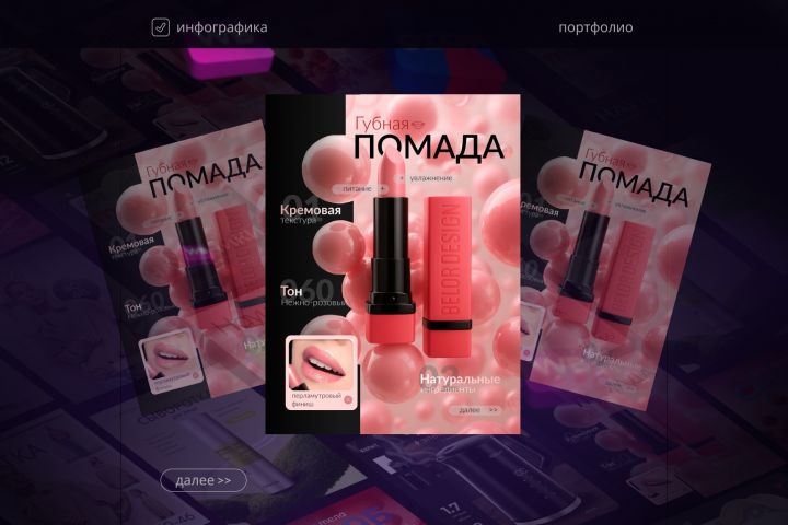 Дизайнер выбрал розовую цветовую гамму, чтобы подчеркнуть нежность и свежесть помады. Центральное место занимает крупное изображение помады и её упаковки. Фон оформлен объемными розовыми шарами, создавая визуальный эффект мягкости и воздушности. Шрифт четкий и контрастный: большие заголовки — черные, тексты характеристик — светлые, что облегчает восприятие. К основным плюсам (питание и увлажнение) добавлены знаки «+» для выделения преимуществ. Небольшое фото с примером использования помады на губах помогает показать результат.