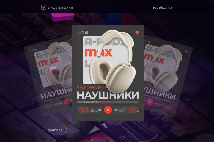- Использована контрастная цветовая гамма: нейтральный фон и мягкие бежевые оттенки наушников с яркими акцентами в виде красного цвета текста и кнопок для выделения ключевой информации (максимальное время работы, качество звука).