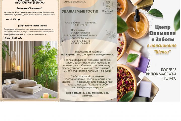 Я полностью продумал концепцию и структуру материалов, подготовил тексты, выделив преимущества и особенности услуг массажного кабинета, а также подобрал дизайн и оформление, которые создают атмосферу комфорта и заботы о здоровье клиента.