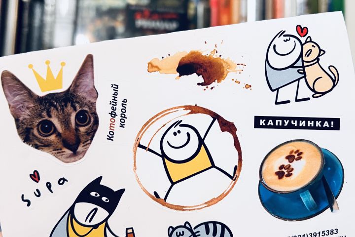 Стикерпак (наклейки) для продажи в кофейнях нашего города. (теги: кот, кошка, кофе, векторная иллюстрация, графический дизайн, разработка, чашка кофе, капучино, кафе, забавные персонажи, детская иллюстрация, книги, стикер, брендирование)