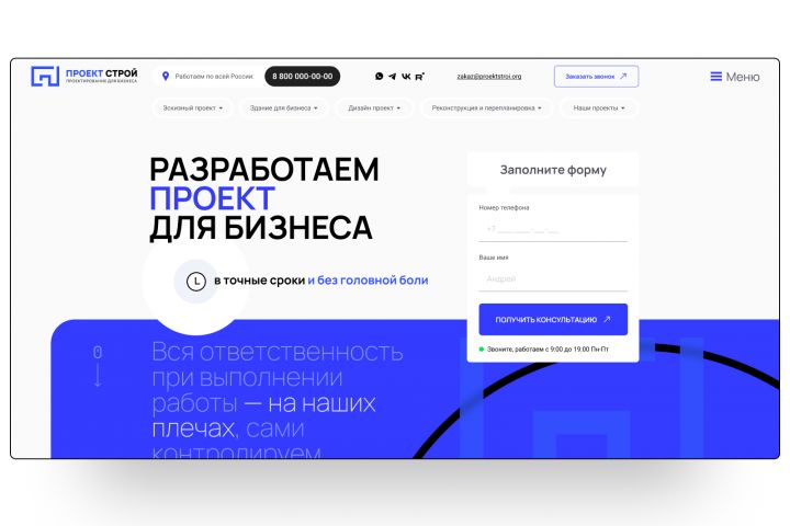 Клиент поставил задачу создать современный и профессиональный дизайн главной страницы, который бы эффективно визуализировал спектр услуг архитектурно-проектного бюро «ПРОЕКТ СТРОЙ» и подчеркнул их экспертизу в сегменте B2B.
