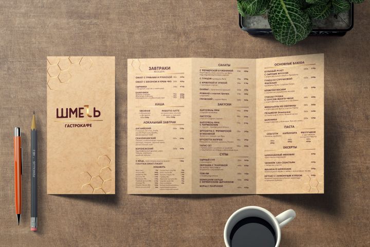 Заказчик обратился с целью разработки стильного меню гастрокафе "Шмель", которое бы подходило под интерьер заведения. В качестве подложки был выбран крафтовый фон, дополненный золотистыми сотами, которые дают отсылку к названию кафе