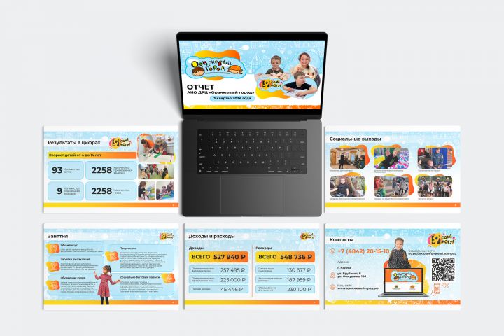 Клиент – автономная некоммерческая организация ДРЦ «Оранжевый город» – поставил задачу разработать презентацию-отчет за третий квартал 2024 года. Основная аудитория презентации – посетители сайта организации и доноры, поддерживающие деятельность НКО.