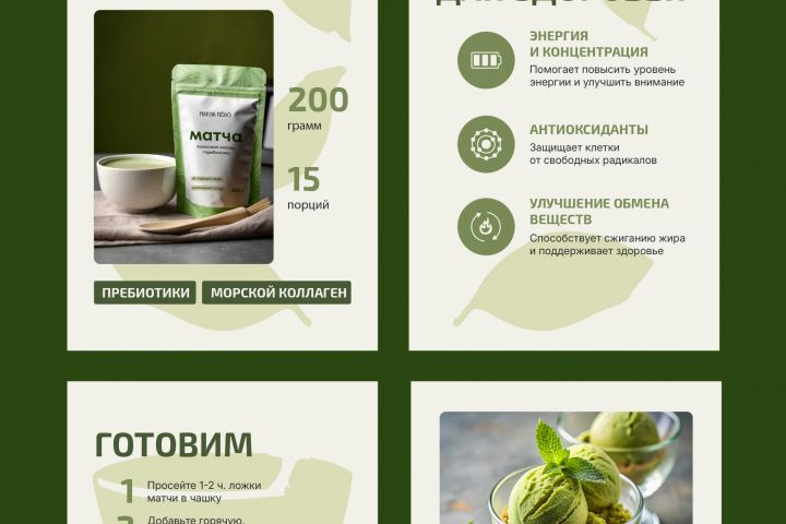 Яркая и информативная карточка товара для маркетплейса: презентация чая матча с упором на пользу, простоту приготовления и многофункциональность. Чистый дизайн с аппетитной фотографией и понятной подачей информации
