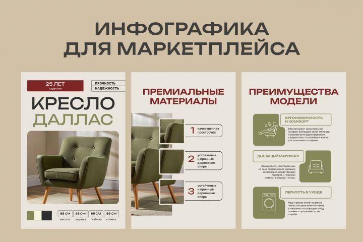 Дизайн карточки товара для кресла с акцентом на вариации цветов, премиальные материалы и ключевые преимущества. Чистая композиция с детализацией характеристик и стильной визуализацией модели. Работа для маркетплейса с упором на продающую подачу и удобство восприятия