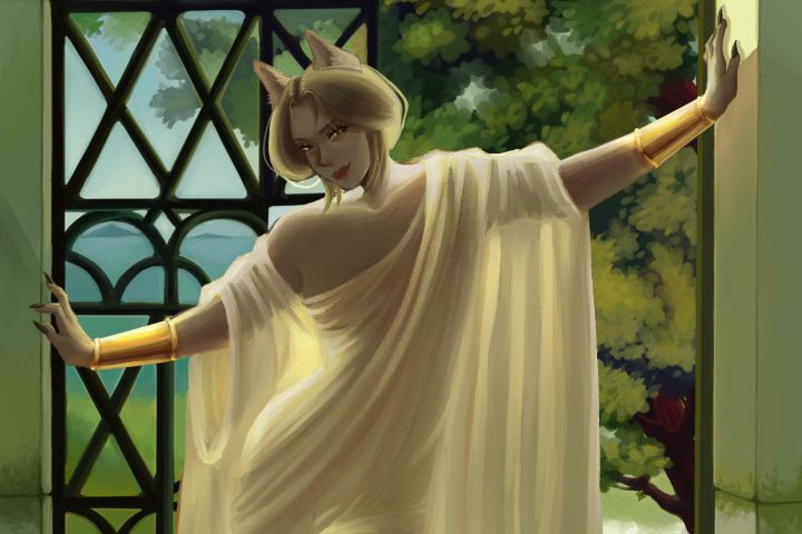 Я создала оригинального персонажа с элементами фэнтези, одетого в легкую полупрозрачную ткань на фоне архитектурного окна и пейзажа. Передала мягкость света, структуру драпировки и эмоцию во взгляде персонажа. Работа выполнена в Clip Studio Paint, использованы мягкие кисти, мультиосвещение и приёмы классической живописи.