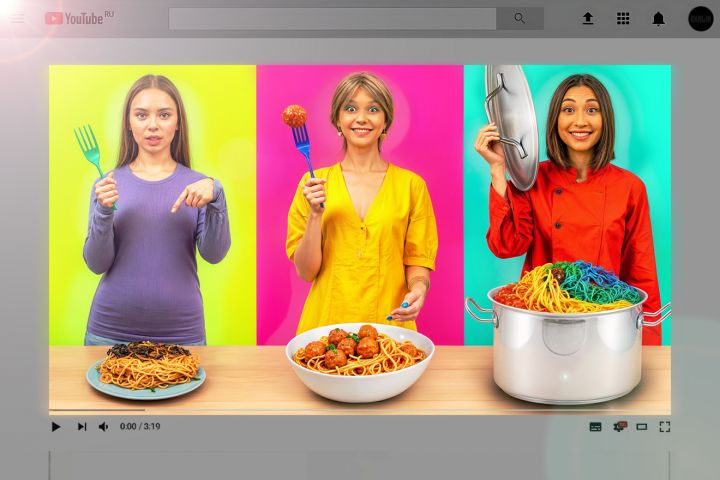 Идея превью-три персонажа ролика показывают свои блюда-разные макароны