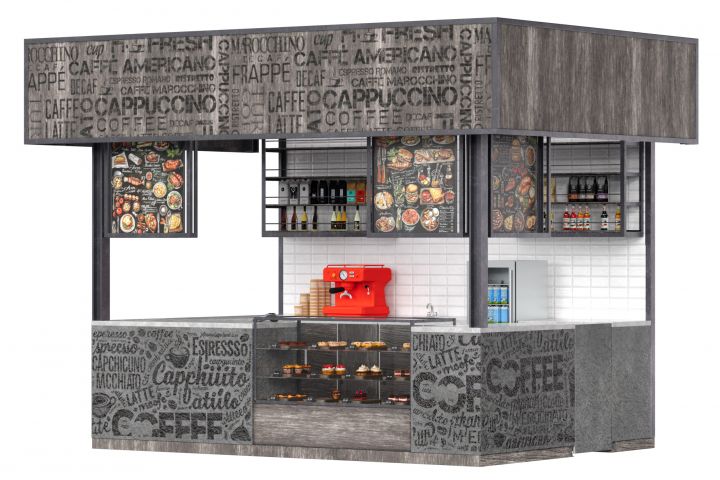 Над прилавком висят четыре больших меню с красочными изображениями блюд и напитков, что помогает клиентам быстро выбрать желаемое. На полках за прилавком аккуратно расставлены бутылки с сиропом и кофейные аксессуары, создавая ощущение порядка и профессионализма. Этот киоск идеально подойдет для утреннего кофе или быстрого перекуса в течение дня, привлекая любителей кофе своим стильным видом и уютной атмосферой.