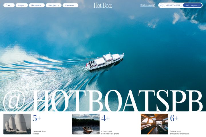 Сайт вызывает ощущение лёгкости и статусности, помогает представить себя на борту — до первого клика по кнопке «Забронировать». Адаптивный, простой в навигации, подчёркивает достоинства компании и фотографии яхт.