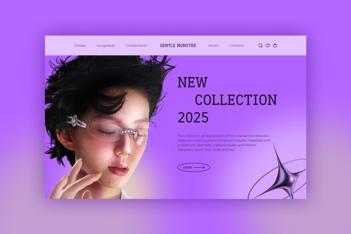 Задача: разработать главную страницу сайта для корейского бренда очков "GentleMonster" для презентации новой коллекции. Дизайн необходимо разработать в 3-х цветовых решениях.