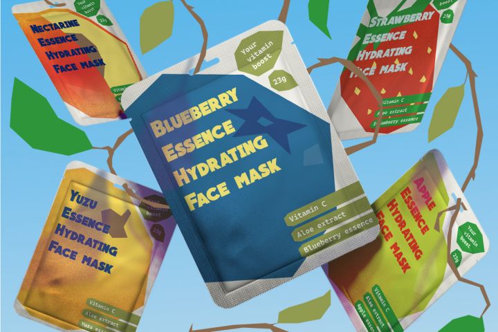 Для основной графики были сделаны простые геометрические иллюстрации фруктов и ягод - основных компонентов масок. Они же дублируются на обратной стороне упаковки, подчеркивая плашку с преимуществами продукта. На обратной стороне всё сделано просто и лаконично, инструкция по применению снабжена коротко иллюстрированной схемой.